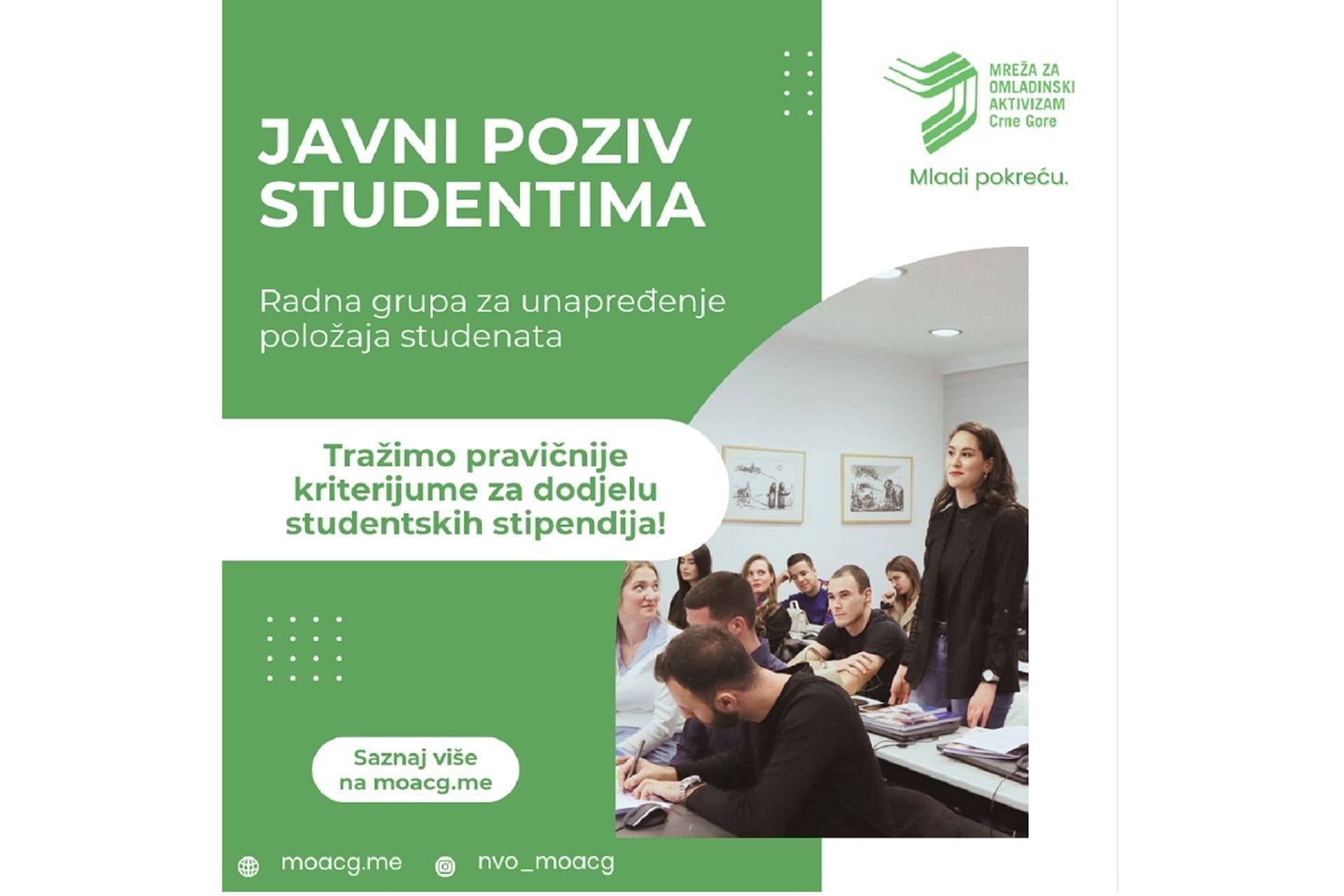 Mreža za omladinski aktivizam Crne Gore (MOACG) objavila je javni poziv za studente svih visokoškolskih ustanova u Crnoj Gori u cilju formiranja radne grupe za unapređenje sveopšteg položaja studenata.