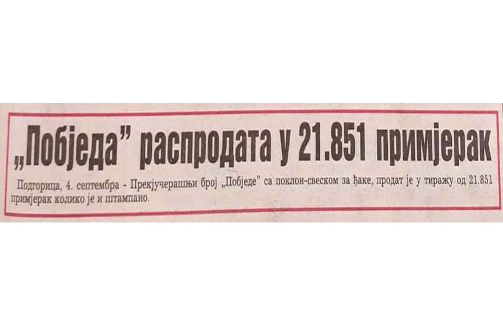 primjerak Pobjede prodat je u poneđeljak 2. septembra 2002. godine. Povodom početka školske godine, uz to izdanje Pobjede poklonjena je i đačka sveska, a kompletan odštampani tiraž je i prodat