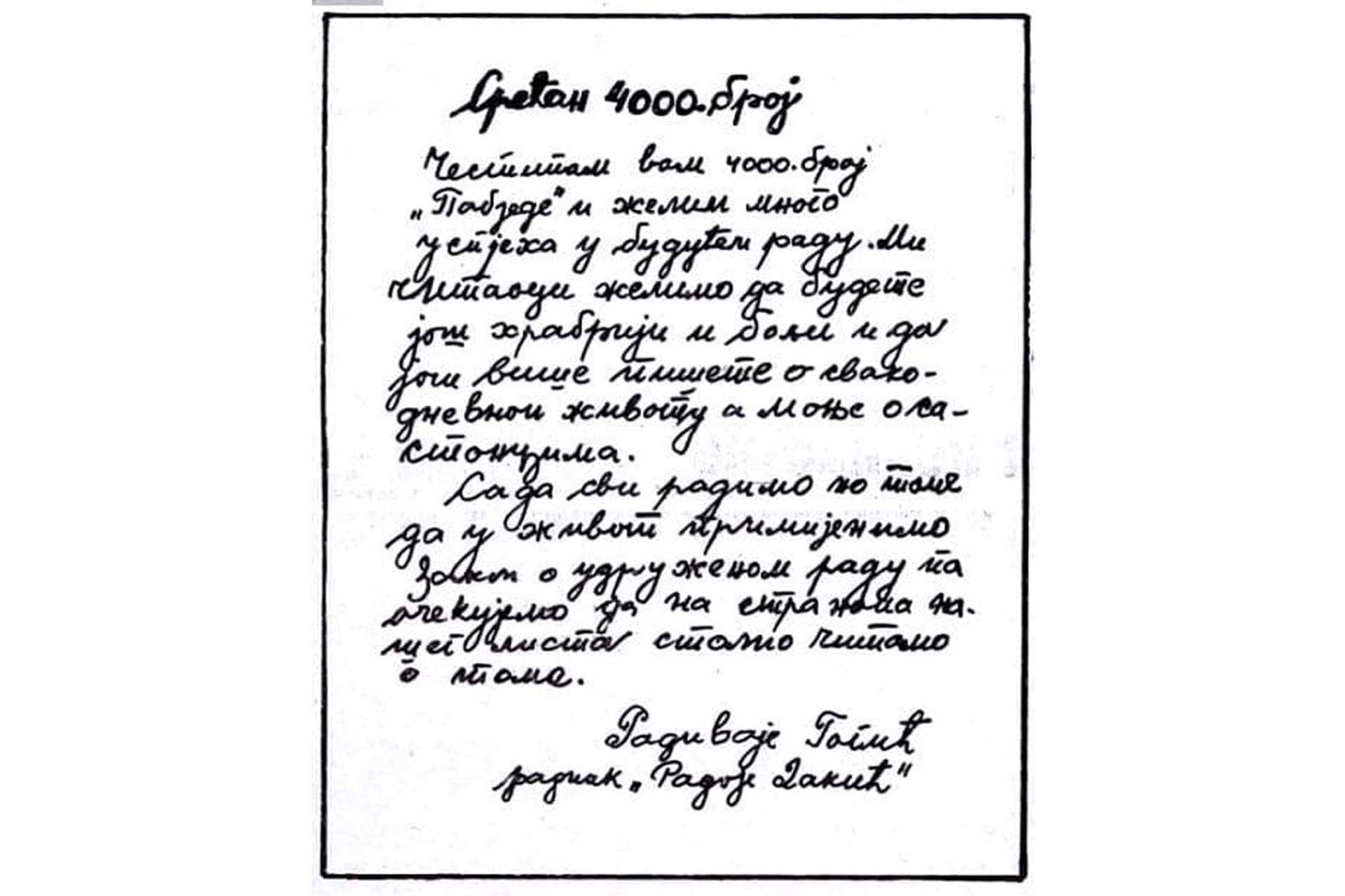 – Čestitam Vam 4000. broj Pobjede i želim mnogo uspjeha u budućem radu. Mi čitaoci želimo da budete još hrabriji i bolji i da još više pišete o svakodnevnom životu, a manje o sastancima. Sada svi radimo na tome da u životu primijenimo Zakon o udruženom radu, pa očekujemo da na stranama našeg lista stalno čitamo o tome – poručio je naš čitalac Gogić u januaru 1977. godine.