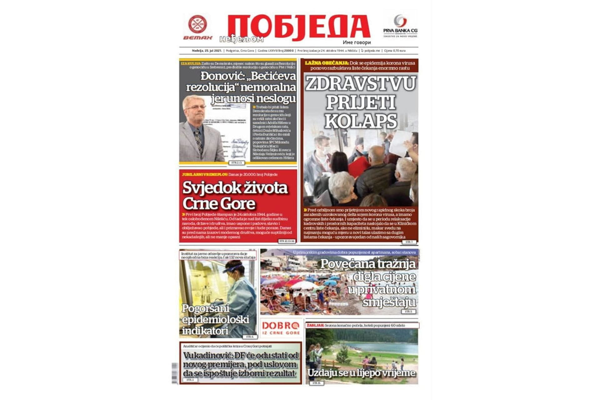 Danas, u neđelju 25. jula 2021. godine, Pobjeda je opet tu, ovog puta pred čitaocima je 20000. broj našeg lista! Novinarstvo je, ostavile su nam u amanet starije kolege, i strast i misao, i volja i zabluda, i nada i strijepnja, i hrabrost i diplomatičnost, i istina i povjerenje, ali i objavljivanje i prećutkivanje. I valjda, iznad svega – trka, izbor i život.