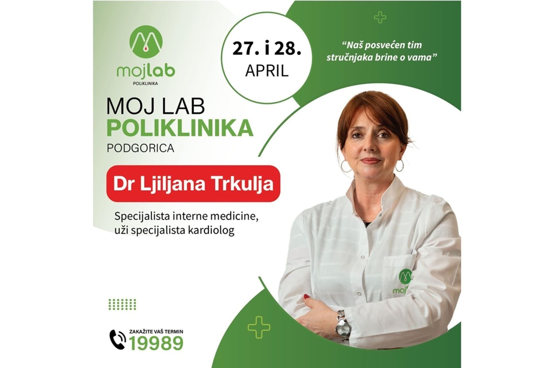 Dr Dejan Kojić kardiolog-interventni elektrofiziolog (sertifikovan od Evropskog udruženja za srčani ritam-EHRA) i dr Ljiljana Trkulja specijalista interne medicine, uži specijalista kardiologije 27. i 28. aprila ordiniraće u Poliklinici Moj Lab u Podgorici.