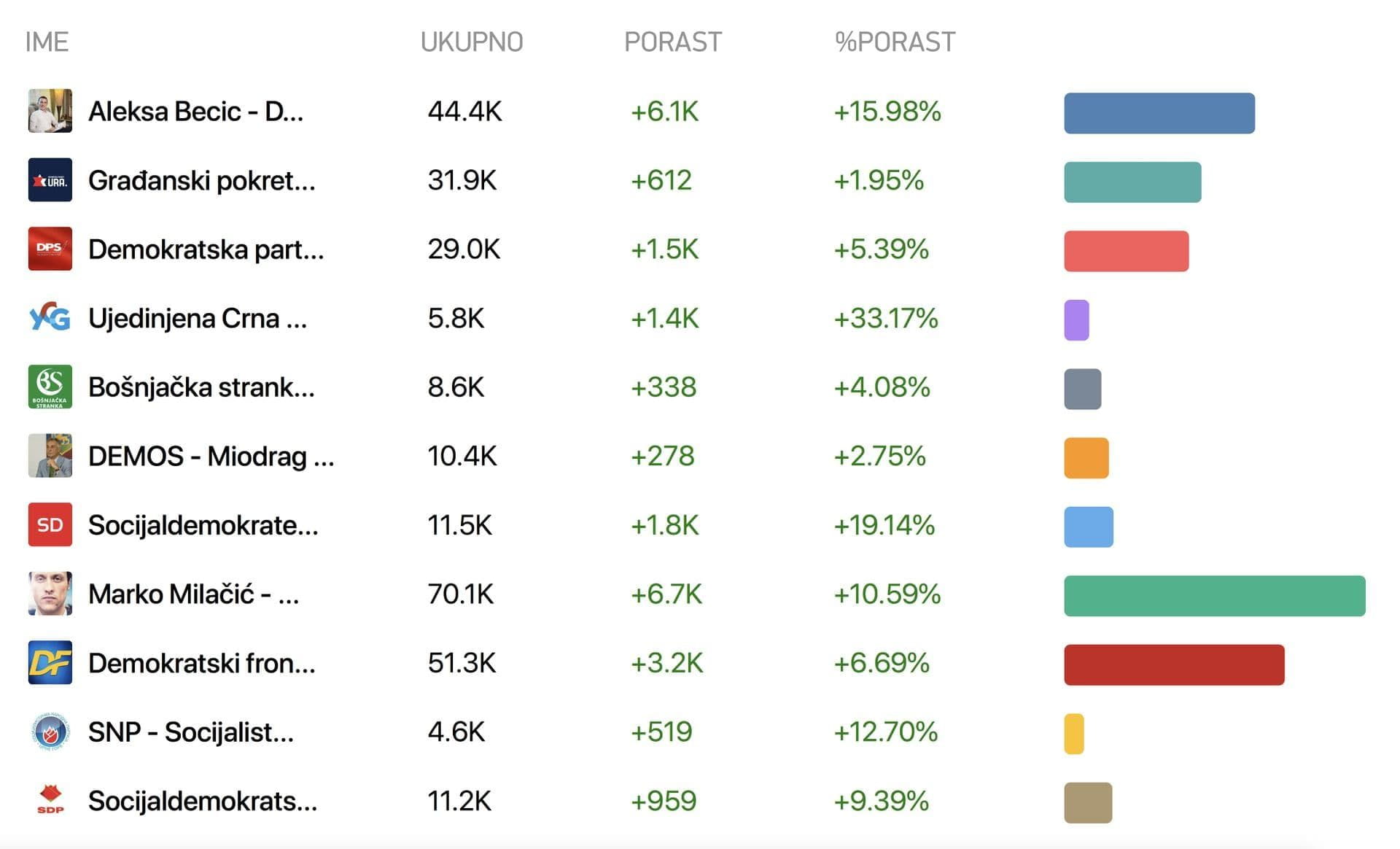 Kada je riječ o broju lajkova na stranici, iz DFC-a ističu fa najveći porast u broju lajkova za period jun-jul bilježe stranice Marko Milačić – Prava Crna Gora sa 6,7 hiljada lajkova i Aleksa Bečić – Demokrate – Demokratska Crna Gora sa 6,1 hiljadu lajkova. Zatim slijede stranice Demokratski front (3,2 hiljade), Socijaldemokrate Crne Gore (1,8 hiljada), Demokratska partija socijalista Crne Gore (1,5 hiljada) i Ujedinjena Crna Gora (1,4 hiljade). Ostale stranice političkih partija bilježe porast u broju lajkova ispod hiljadu za ta dva posmatrana mjeseca.