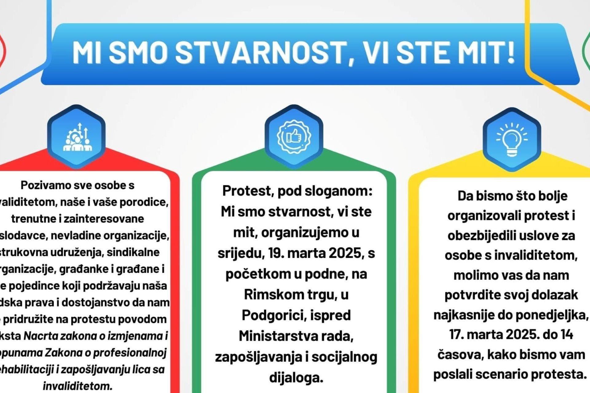 Iz Udruženja mladih sa hendikepom Crne Gore pozivaju sve osobe s invaliditetom, poslodavce, nevladine organizacije, strukovna udruženja, sindikalne organizacije, građanke i građane da im se pridruže na protestu povodom teksta Nacrta zakona o izmjenama i dopunama Zakona o profesionalnoj rehabilitaciji i zapošljavanju lica sa invaliditetom.