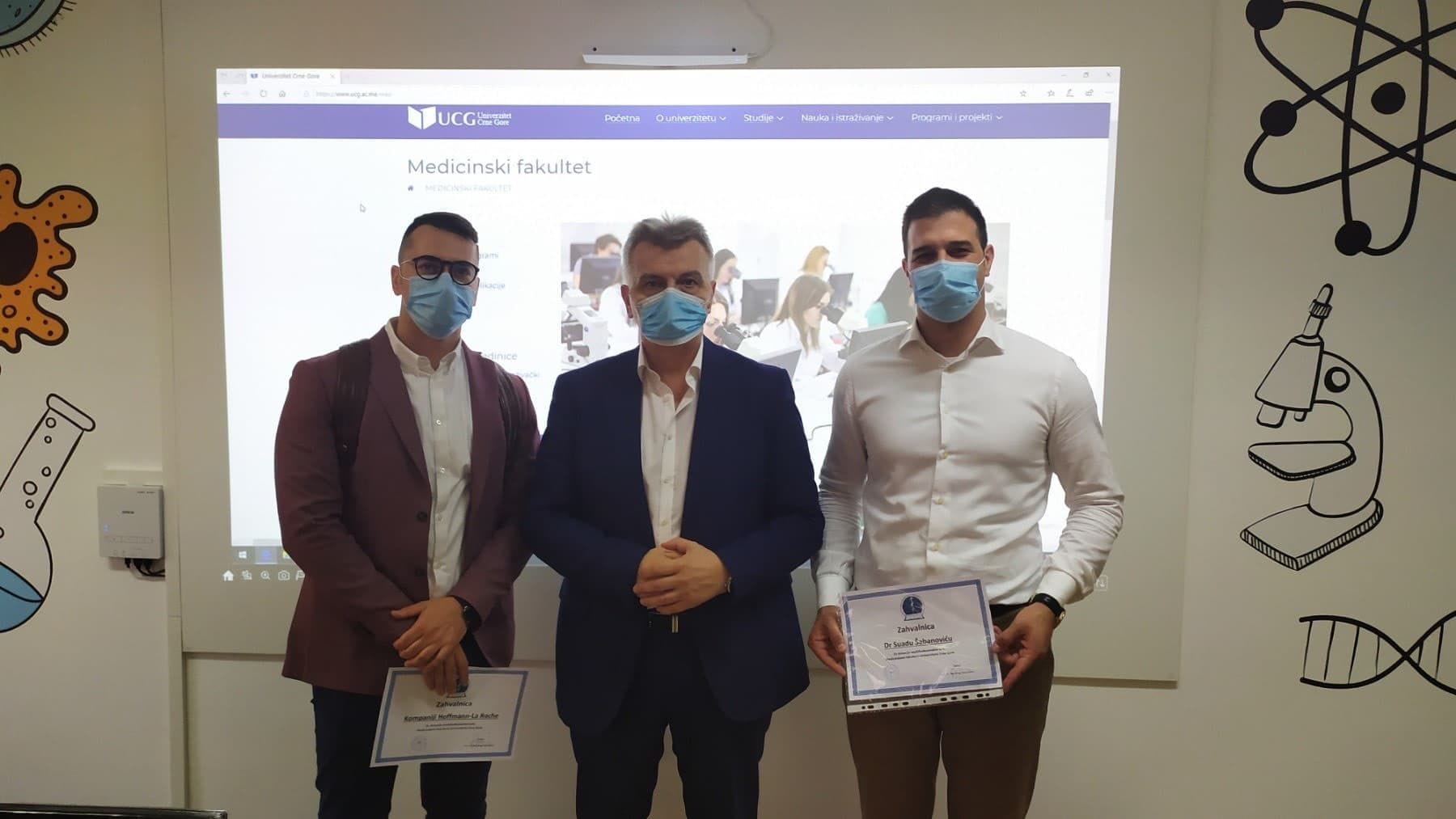 Dekan Medicinkog fakulteta u Podgorici prof. dr Miodrag Radunović uručio je zahvalnice kompaniji Hoffmann - La Roche, dr Milošu Ičeviću, direktoru Hoffmann-La Roche Crna Gora i dr Suadu Šabanoviću, specijalisti za proizvode i stratešku analizu.
