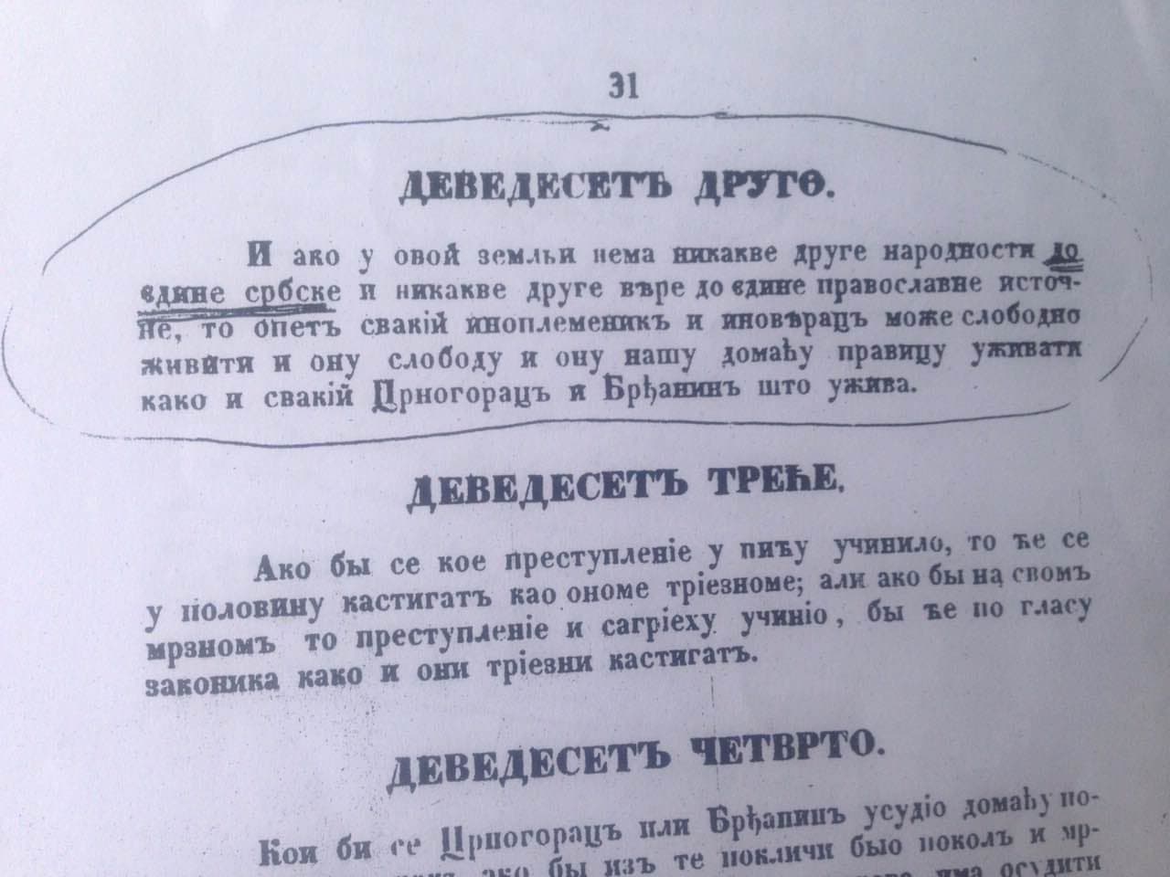 И данас се провлаче и као аргумент користе фалсификати направљени од стране увозних кадрова (свака сличност са временом данашњим је упозоравајућа, да има коме). Требало је да прође скоро вијек и по да се открије и прокоментарише начин и посљедице кривотворења Даниловог законика, када је у чл. 92. додата „само“једна ријеч (односно три), која је фактички мијењала национални састав Црне Горе. Секретару књаза Данила „омакло“ се па је умјесто члана који је у оригиналу гласио: „И ако у овој земљи нема никакве друге народности и никакве друге вјере...“, добијено у штампаноме виду: „И ако у овој земљи нема никакве друге народности до једине српске и никакве друге вјере...“