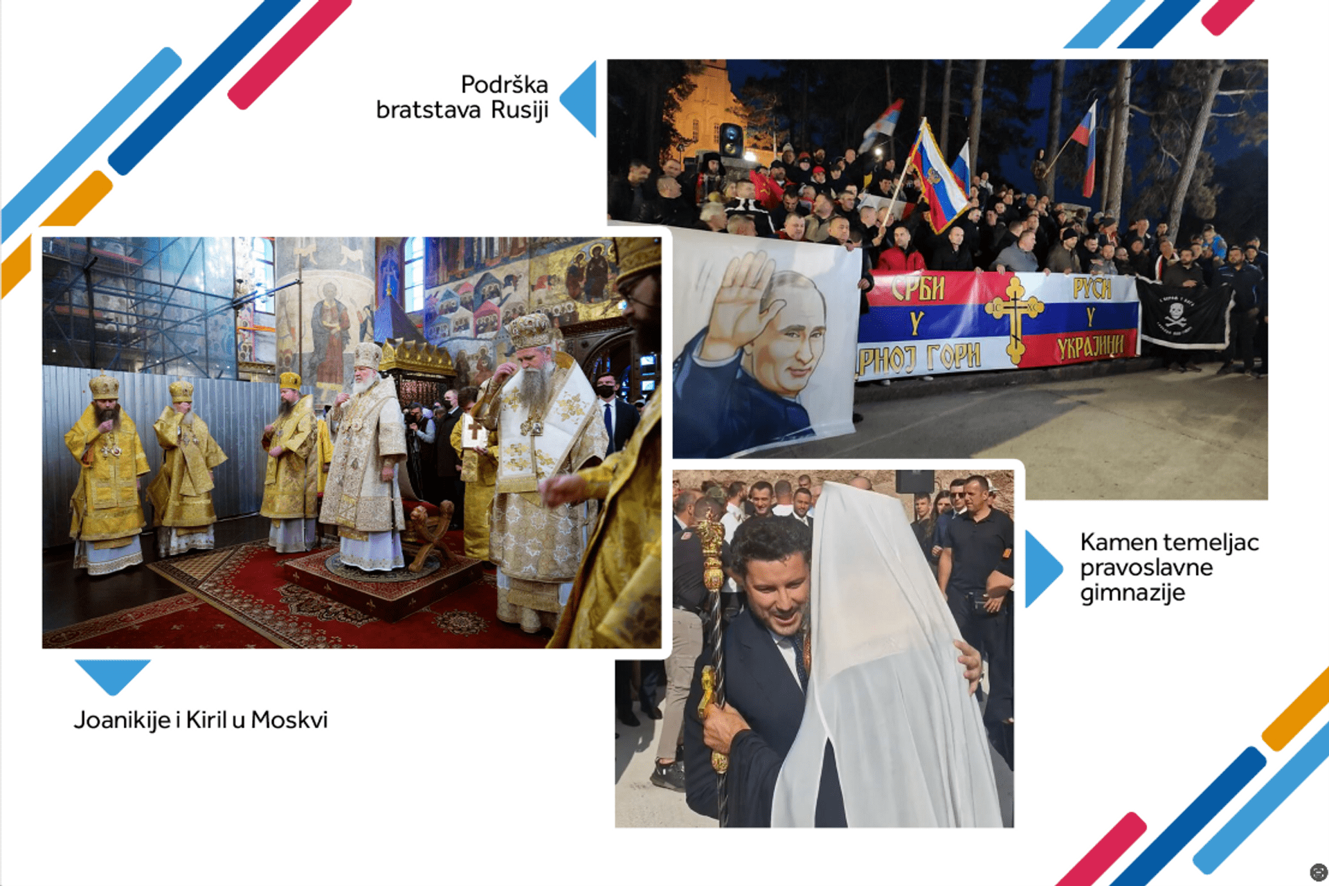 Vladimir Božović je 2015. godine, identifikovao Srpsku pravoslavnu crkvu (SPC) kao ključni vektor za ostvarivanje strategije uticaja Rusije i Srbije u Crnoj Gori. Utemeljenje za takvu tvrdnju potkrijepio je iskazom da je Crna Gora zemlja pravoslavne, proruske i panslovenske duhovne suštine povlačeći paralelu između Crne Gore i Ukrajine. U procesu širenja uticaja Ruska pravoslavna crkva (RPC) ima isti zadatak u Ukrajini kao SPC u Crnoj Gori. U Crnoj Gori, SPC se oslanja na pravoslavna bratstva i organizacije koje permanentno dijele crnogorsko društvo, organizuju antizapadne i aniti-NATO proteste i utiču na podjele i radikalizaciju crnogorskog društva tokom važnih društveno-političkih događaja. Aktivnosti SPC prevazilaze duhovnu ulogu crkve u društvu i realizuju se kroz para-političku agendu. Ciljevi te agende se materijalizuju kroz Božovićevu tezu o sadržajnom volumenu srpske i proruske društvene svijesti, odnosno o objedinjavanju litijskog političkog potencijala, pa SPC opredjeljujuće utiče na političke procese u državi. U periodu2015 – 2017. godine, SPC je učestvovala u anti-NATO aktivnostima i bila glavni oslonac prosrpskih i proruskih aktera u antizapadnoj agendi.