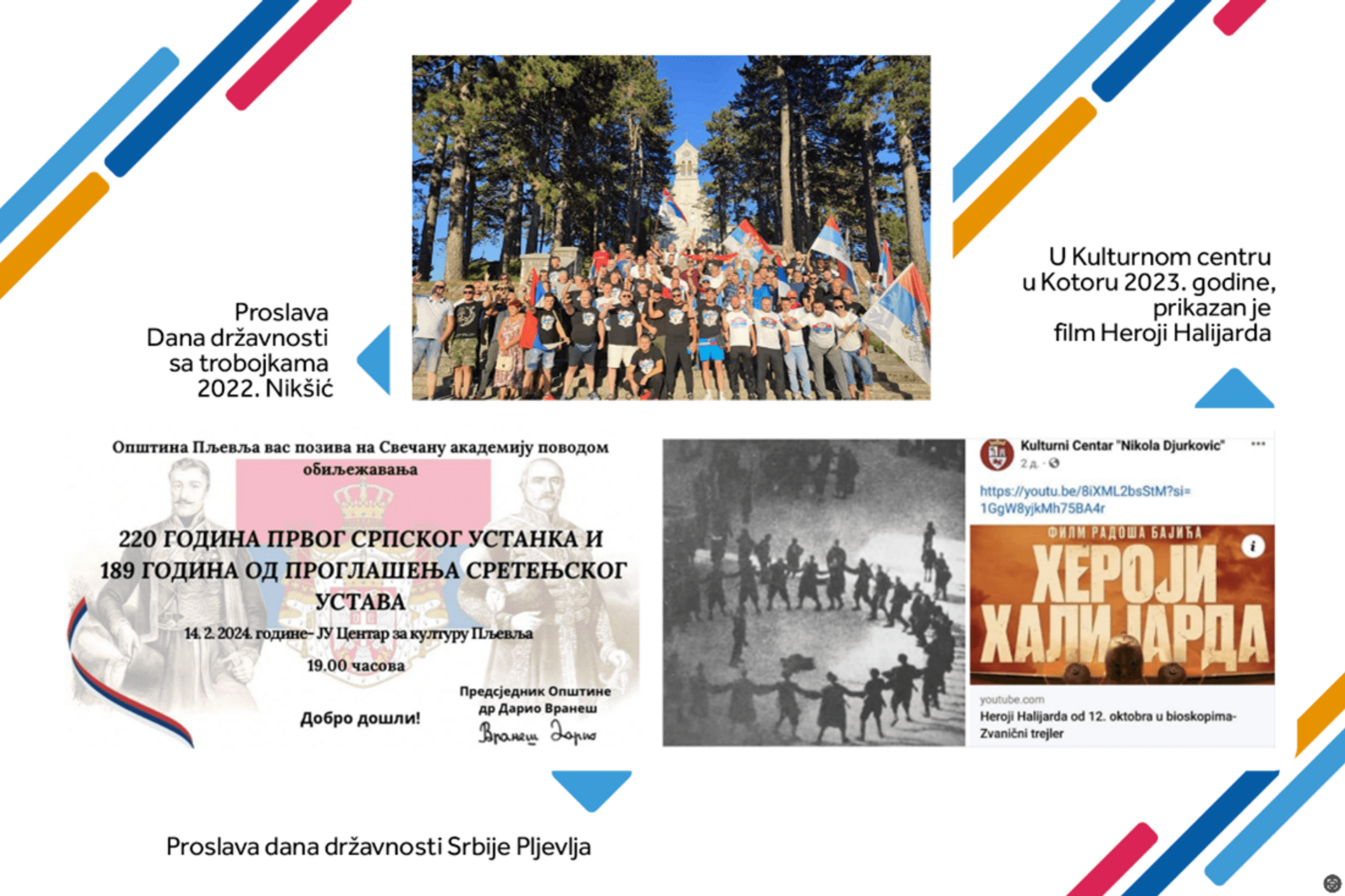 Negiranje crnogorskog identiteta i građanskog uređenja države srpski proksiji ostvaraju sofisticiranom strategijom na lokalnom nivou. Dok se na državnom nivou nominalno zalažu za ulazak Crne Gore u EU, proruski proksi akteri u lokalnim sredinama ostvaruju agendu koja je nespojiva sa EU integracijama. Volumen rusko-srpske meke moći targetirao je Pljevlja, gdje je prvo koalicija na vlastiu septembru 2023. godine odlučila da se, umjesto 20. novembra (kada je 1944. godine grad oslobođen od okupatora) Dan opštine ubuduće obilježava na pravoslavni vjerski praznik Sveta Petka. Godinu kasnije, 15. februara, opštinaPljevlja je obilježila Dan državnosti Srbije. U Kulturnom centru u Kotoru 2023. godine, koji nosi ime Nikole Đurkovića, borca Narodnooslobodilačkog pokreta kojeg su ubili četnici prikazan je film Heroji Halijarda koji veliča kolaboracionistički četnički pokret iz Drugog svjetskog rata. U Budvi je 2021. godine Dan nezavisnosti proslavljen uz srpske trobojke na javnim površinama. Srpsko-ruske propagande manifestacije u Nikšiću i direktne donacije iz budžeta Srbije opštinskim vlastima 2021. godine ilustruju sveobuhvatnost agende srpsko-ruskih etnonacionalističkih i desničarskih subjekata u Crnoj Gori.