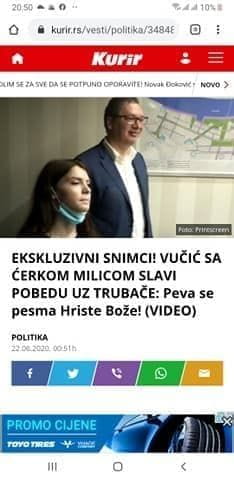 Na snimku koji je pod naznakom ekskluzivno objavio beogradski tabloid Kurir, u ponedjeljak 22. juna, vidi se vidno raspoloženi predsjednik Srbije kako u društvu svoje kćerke Milice, premijerke Ane Brnabić i najviših funkcionera svoje partije slavi pobjedu uz trubače i himnu ,,crvenih beretki“.